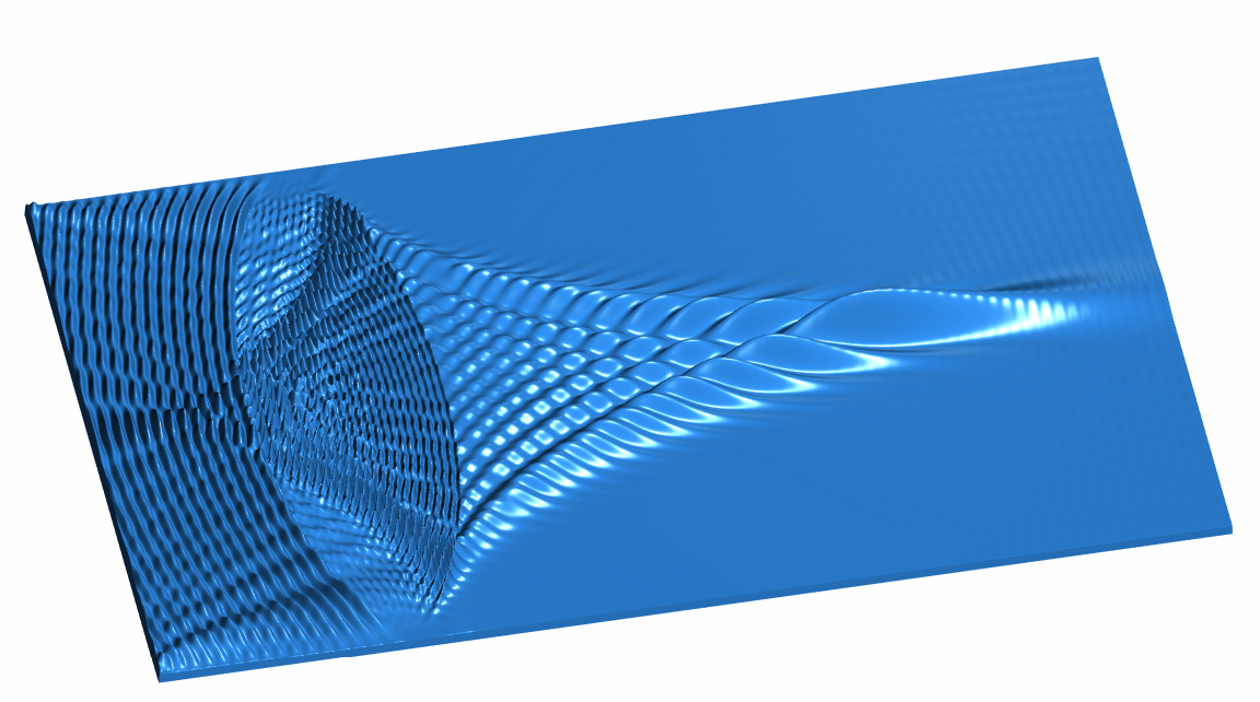 Result from my wave simulator of light passing through a biconvex lens. 2.6M faces, 242 layers.